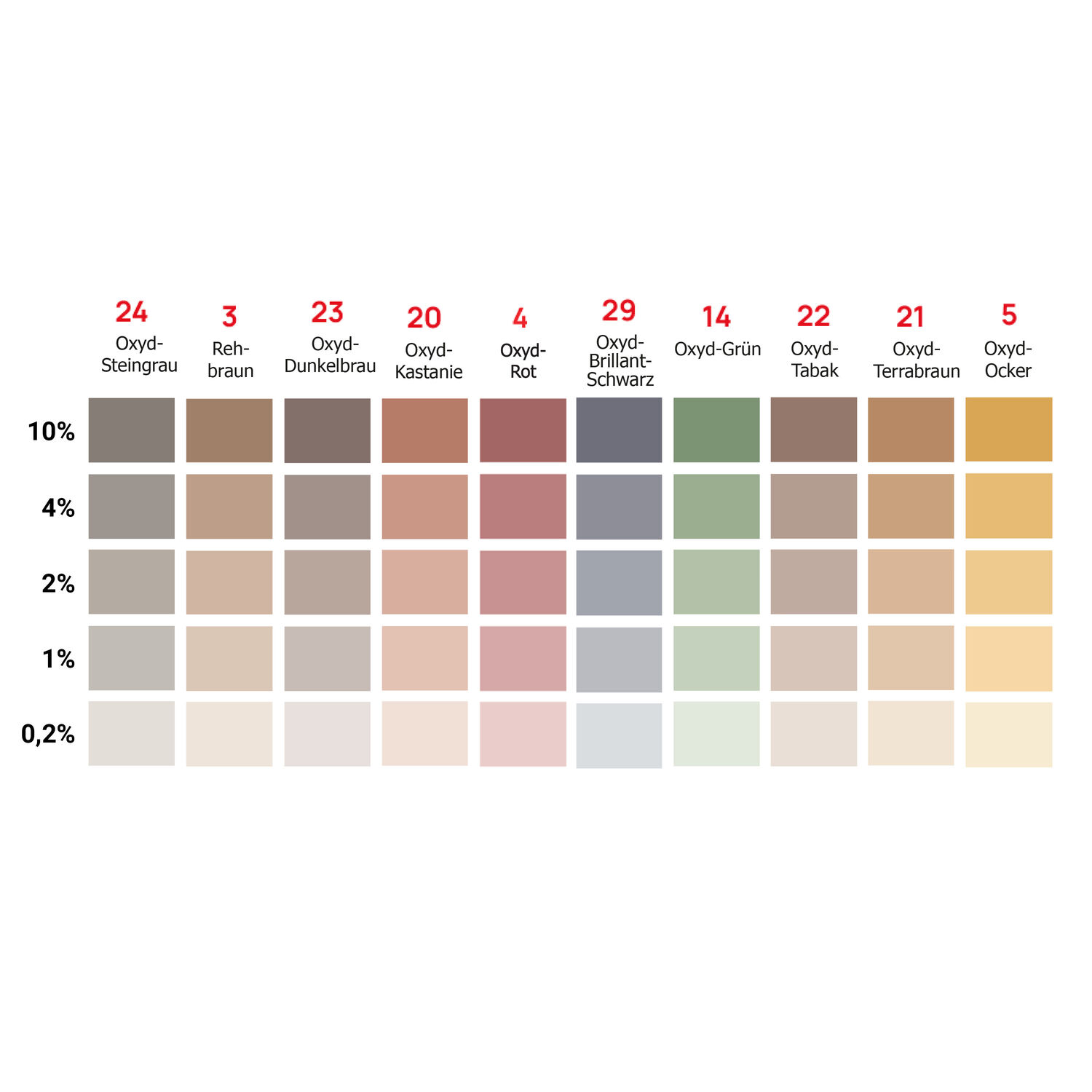 MIXOL oxide types zijn anorganische, minerale pigmenten die perfect compatibel zijn met silicaatverven dankzij hun speciale chemische structuur.
